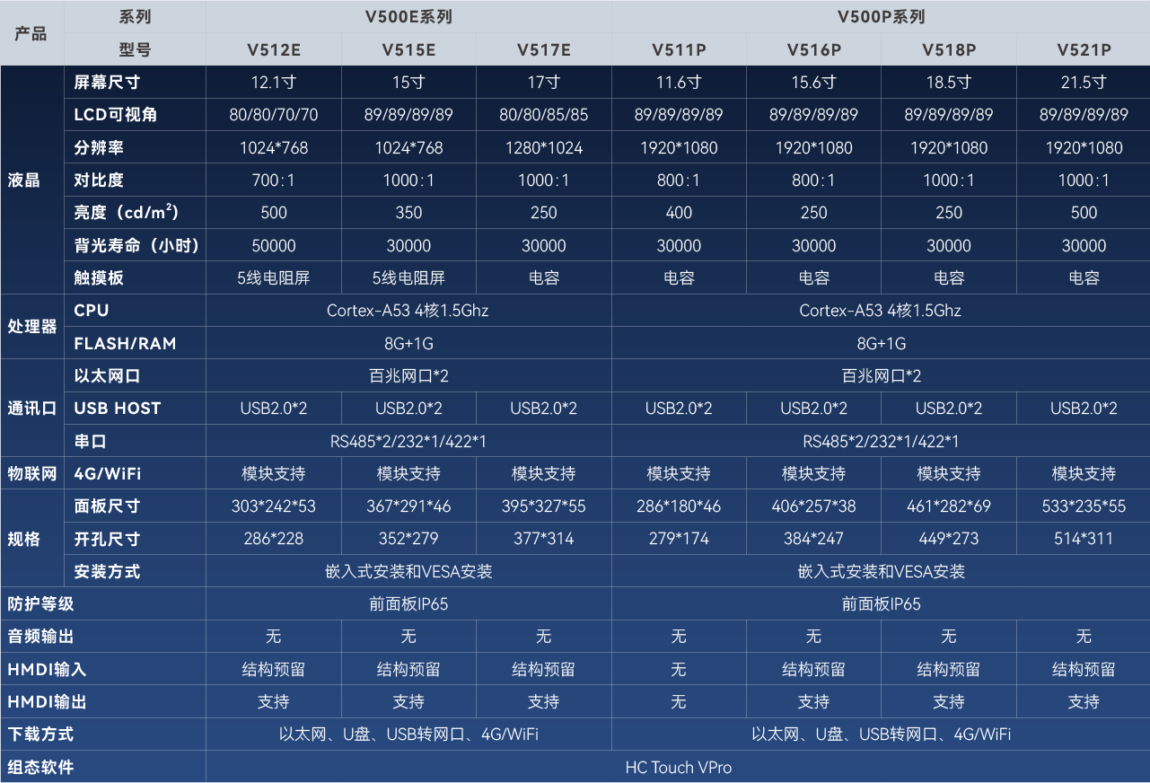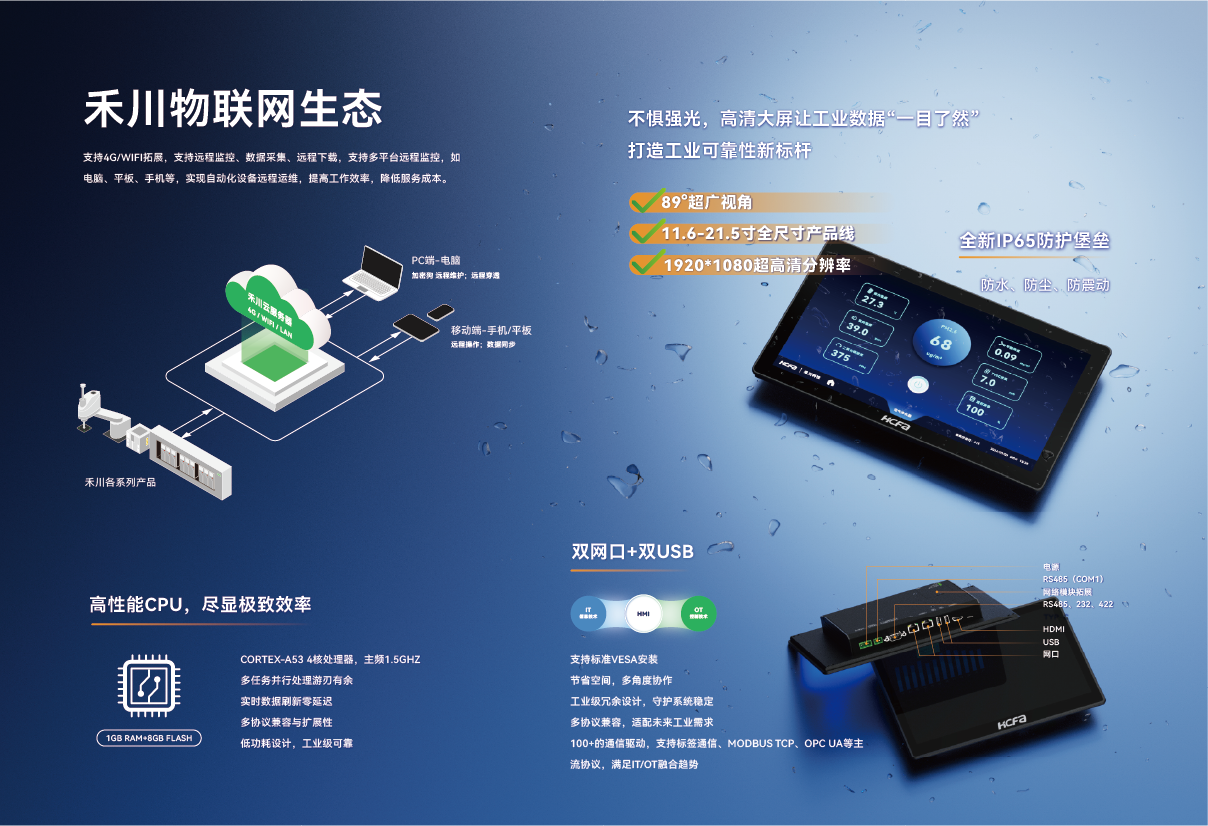禾川精致型HMI,提供11.6寸/12寸/15寸/15.6寸/17寸/18.5寸/21.5寸产品,配备高性能处理器和大容量存储,接口丰富,灵活拓展,能够快速处理大量数据,主要面向高性能、智能化工业系统。