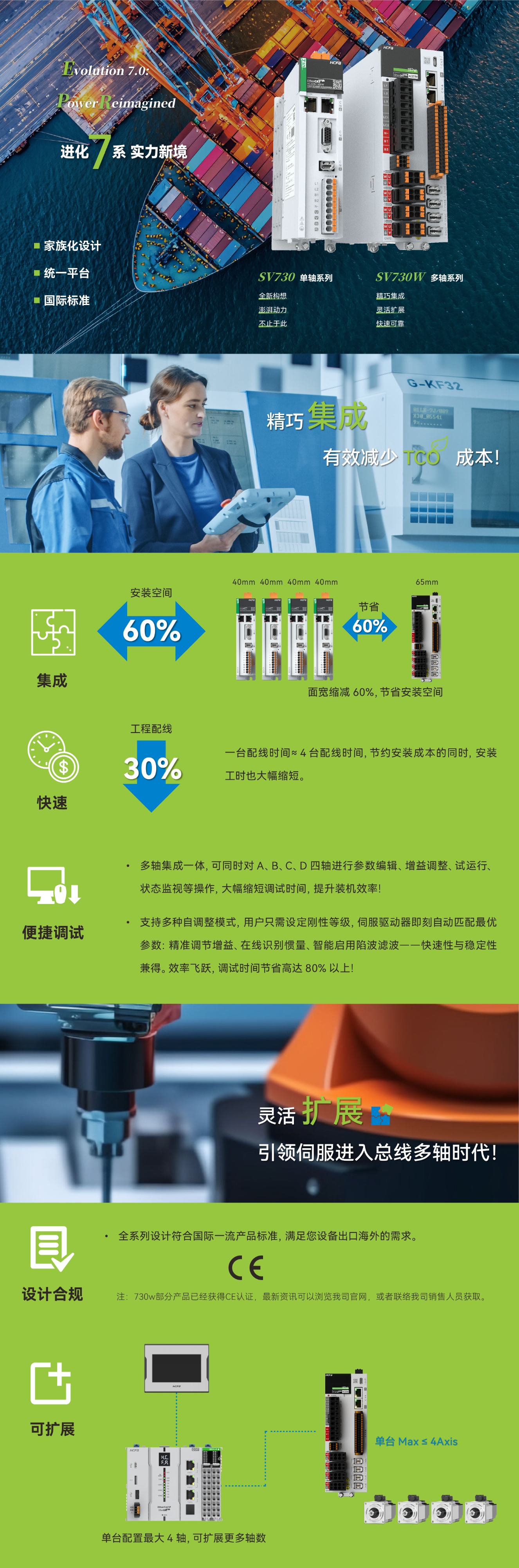 SV730W多轴一体高阶交流伺服系统,具有集成安装、便捷调试、可扩展等产品特点,可满足光伏,锂电的需求,引领伺服进入总线多轴时代!