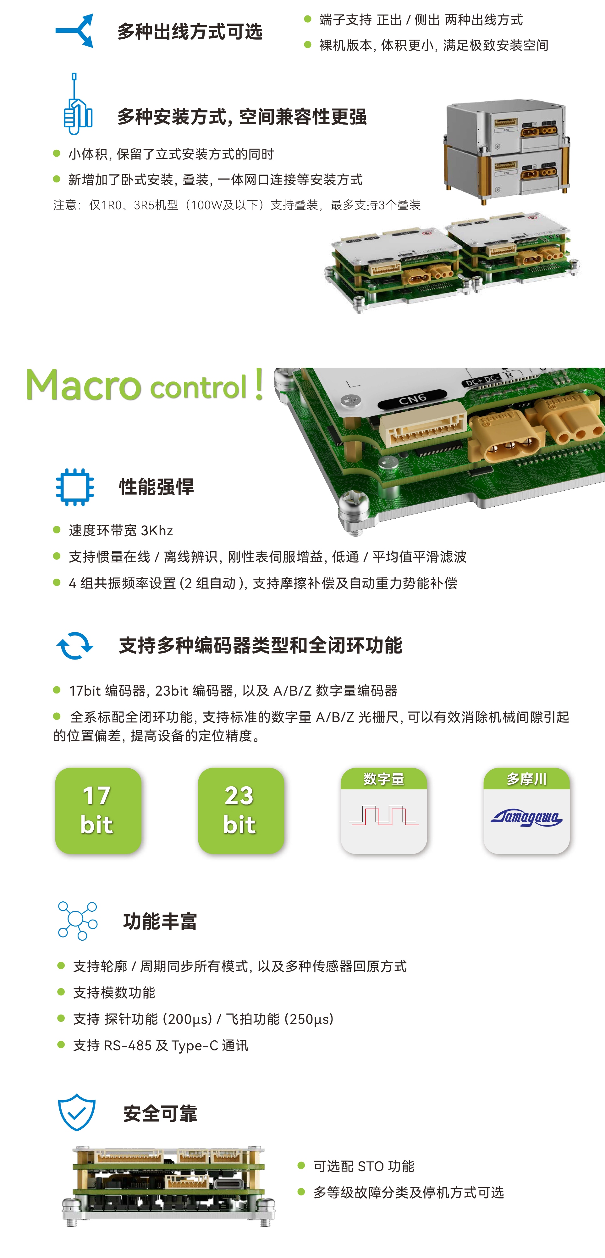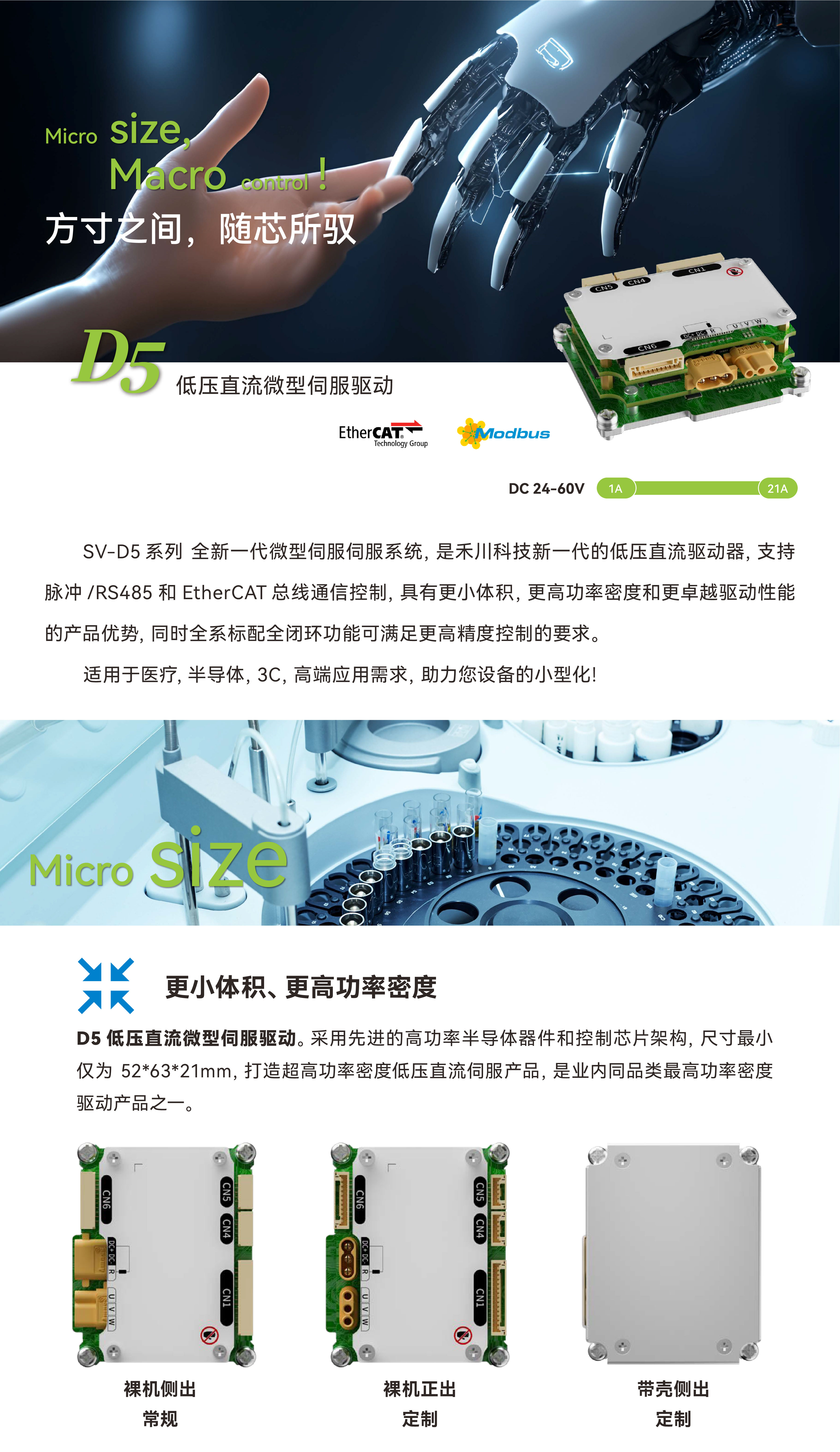 SV-D5系列微型伺服系统,是禾川科技新一代的低压直流驱动器,支持脉冲/RS485和EtherCAT总线通信控制,具有更小体积,更高功率密度和更卓越驱动性能的产品优势,同时全系标配全闭环功能可满足更高精度控制的要求。适用于医疗,半导体,3C,高端应用需求,助力您设备的小型化!