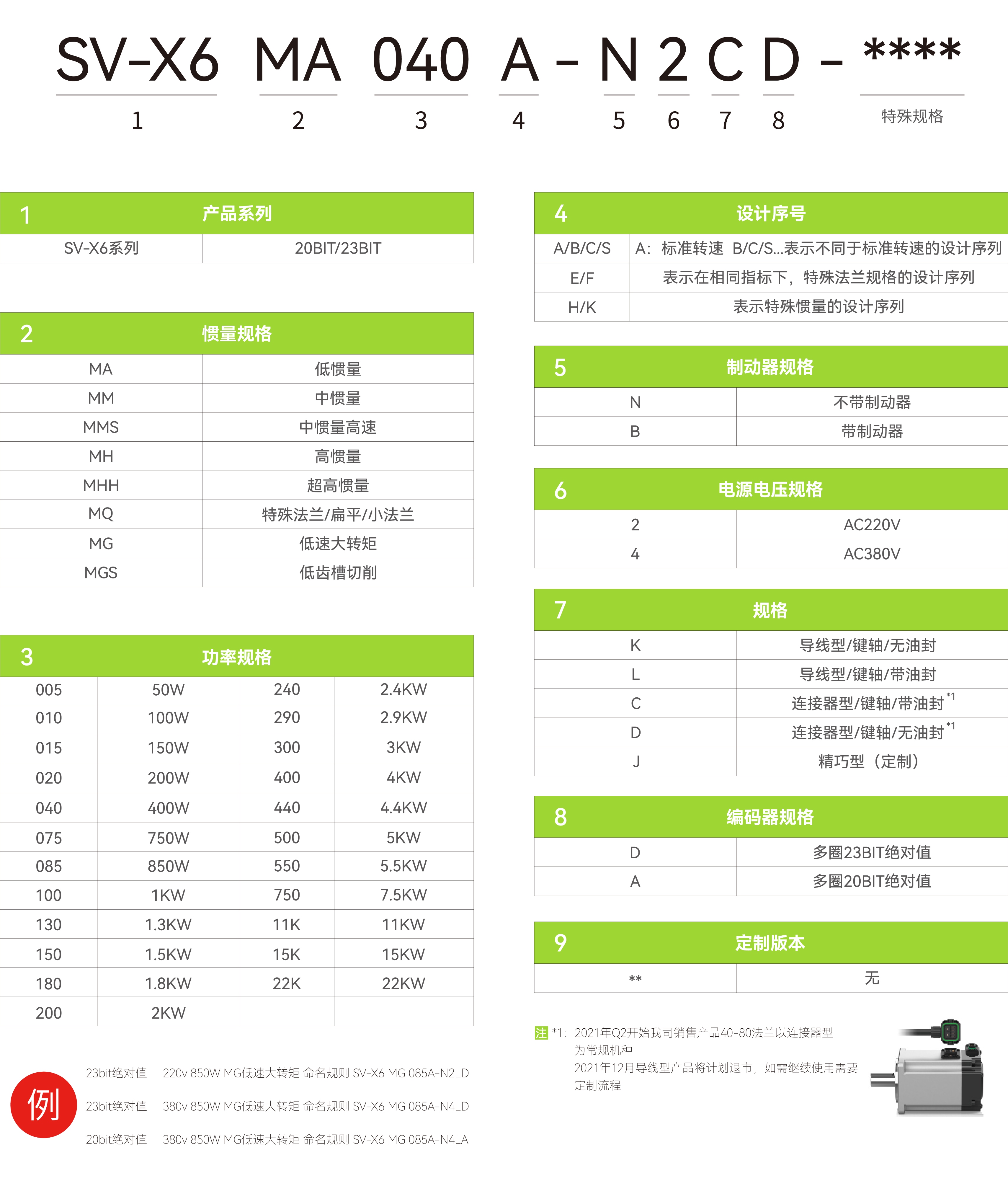 X6系列电机定位于高性能型伺服电机,可搭配多圈25bit分辨率绝对值编码器、提供AC220V和AC380V两个电压等级的产品,更广泛的功率范围、更高的精度和速度、最大限度发挥系统和设备性能