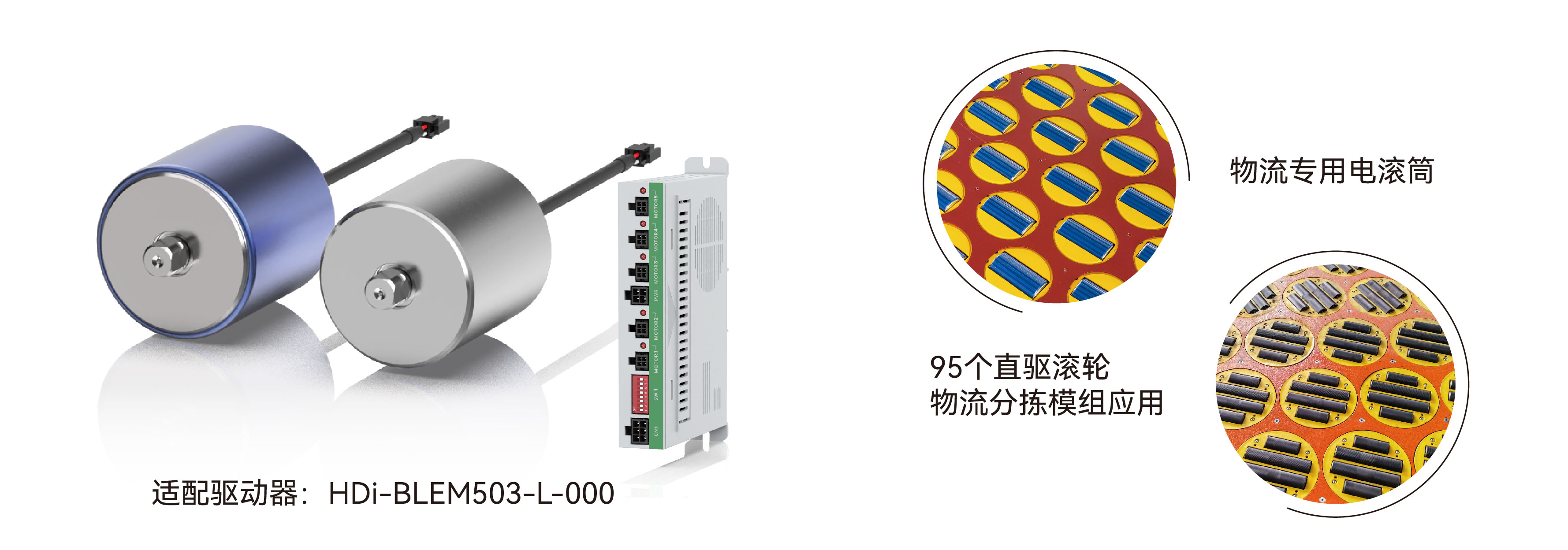 摆轮用直驱电动滚筒,应用于高速摆轮分拣,通过转向控制器改变摆轮的运行方向,可实现货物30°、45°、90°转向,双向分拣,搭配BLEM-503摆轮驱动器使用