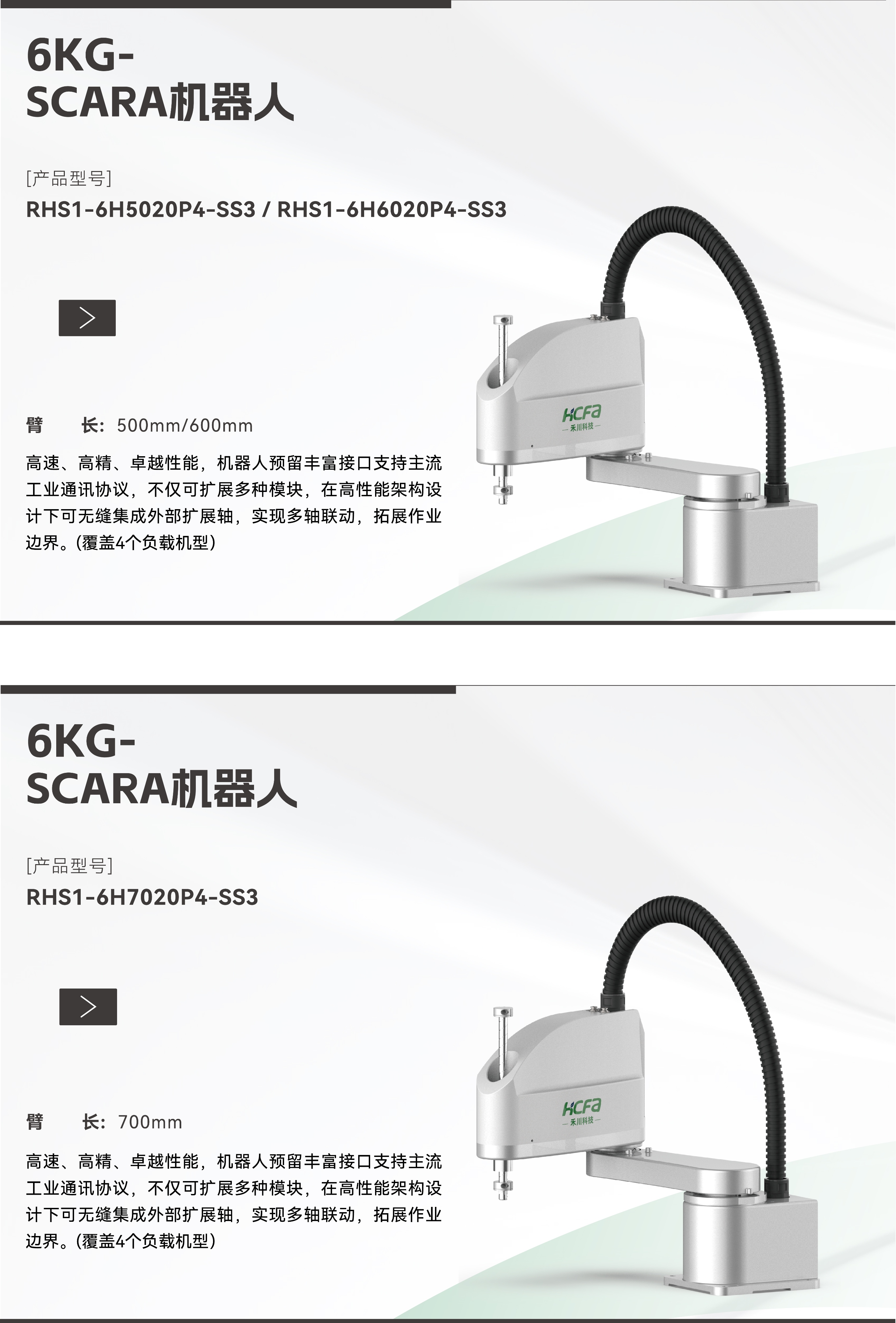 提供500mm、600mm、700mm三种臂展,适配精密装配、搬运、检测等多样化产线需求,兼顾速度与精度。