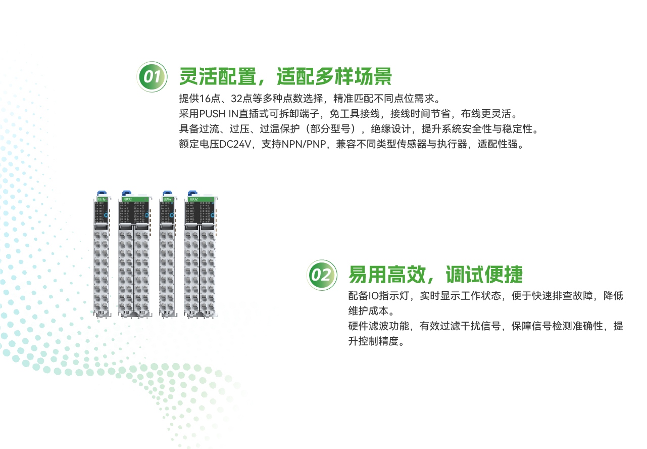 4款数字量输出模块,模块覆盖16点和32点的数字量输出,最小机身仅13mm,端子采用可拆卸和PUSH IN (免工具)接线端子,支持NPN或PNP输出方式,可根据使用极性选择相应型号。