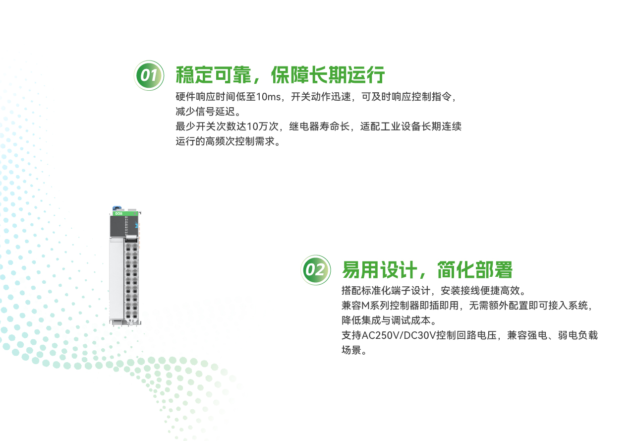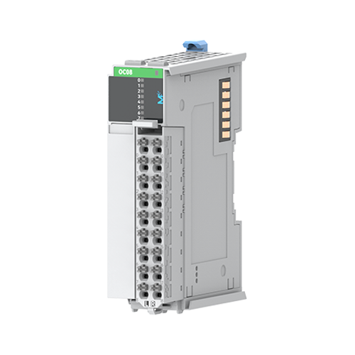 本模块为继电器输出,8通道输出点,端子采用可拆卸和PUSH IN (免工具)接线端子。额定负载电流(电阻)可达2A/点,8A/公共端。额定负载电压(控制回路电压)支持DC30V或者AC250V。ON/OFF响应时间为10ms,开关次数大于10万次!
