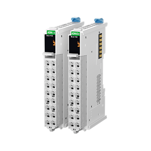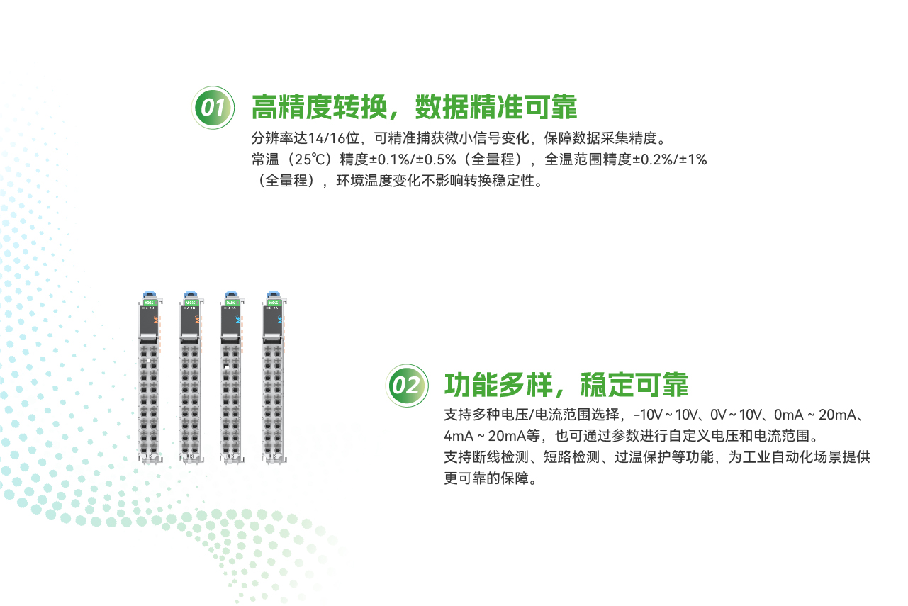 2款模拟量输入模块,分为16位分辨率、14分辨率的4通道模拟量输入,最小机身仅13mm,端子采用可拆卸和PUSH IN (免工具)接线端子。支持4种电压模式和3种电流模式可选择,支持软件滤波、超限检测、校准等功能。