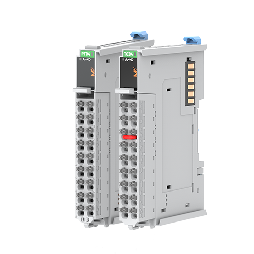 2款温度模块,分为热电阻和热电偶传感器输入的的模块,分辨率为24bit,精准度±0.1%,支持冷端补偿(热电偶型)、断线检测、超限检测、通道开启和关闭等功能。端子采用可拆卸和PUSH IN (免工具)接线端子。