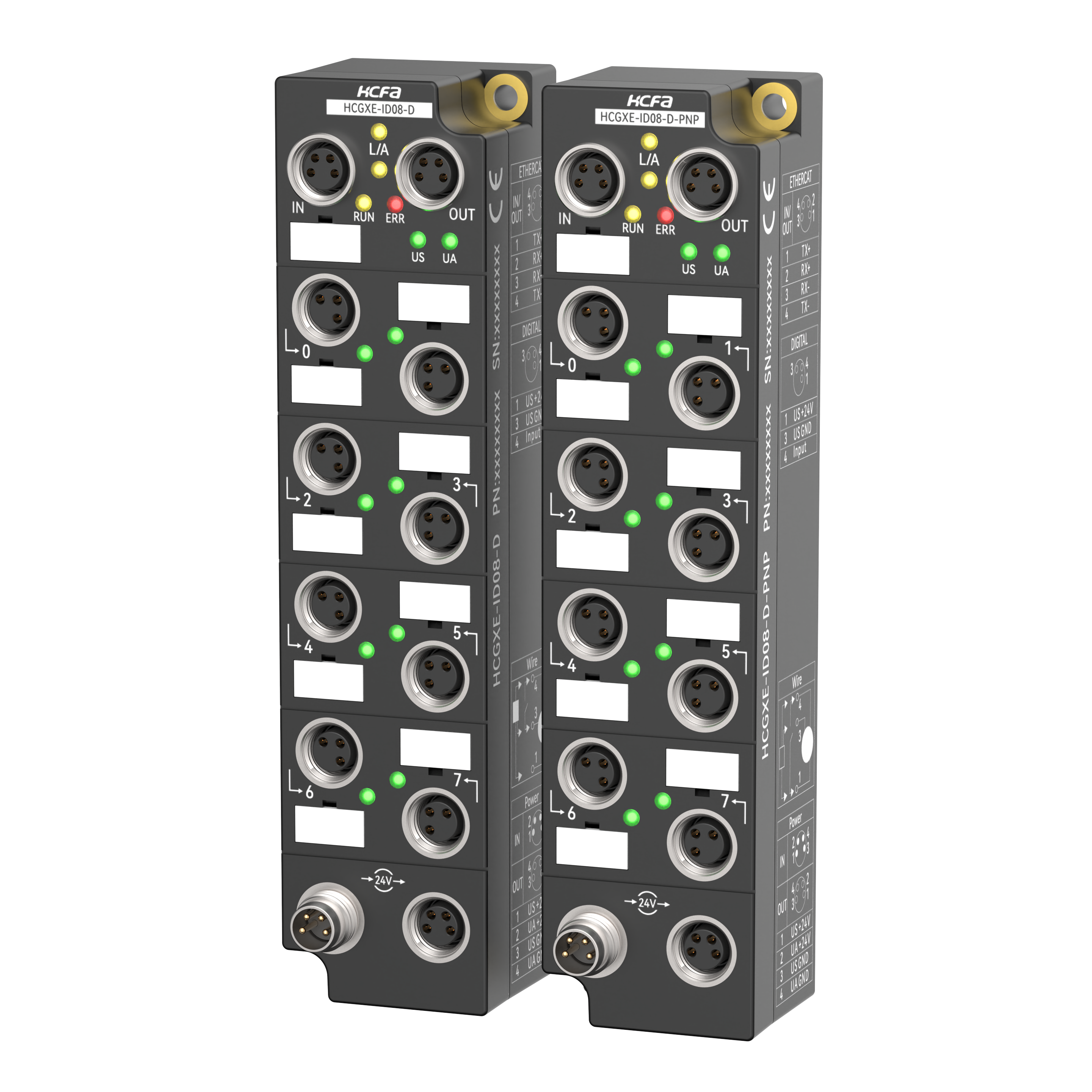 GXE是高防护等级的EtherCAT远程IO,防护等级高达IP67,可在柜内使用和开放式及室内使用,工作温度范围-25~60°C,适合在需要高防护的场合下使用。数字量输入模块分为NPN和PNP两款,都为8点数字量输入。数字量输入:DC24V, 4.1mA/Ch。