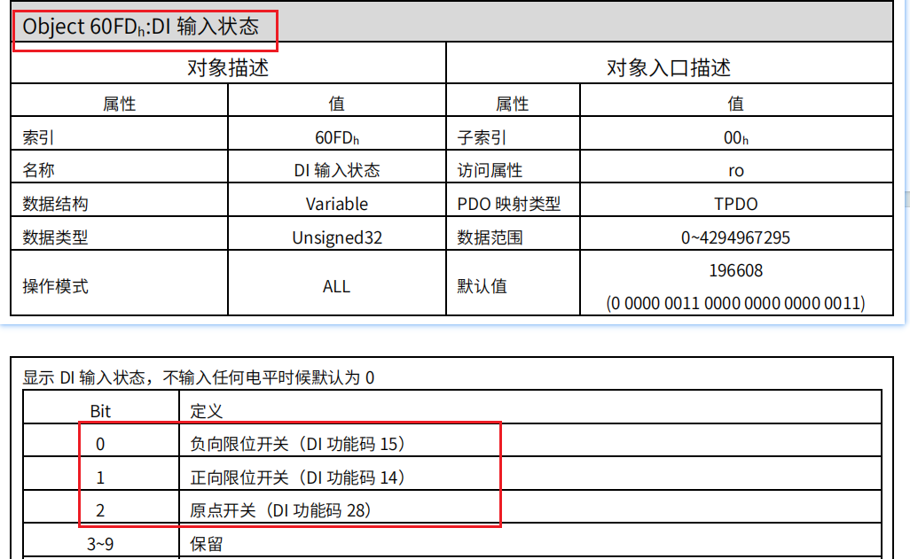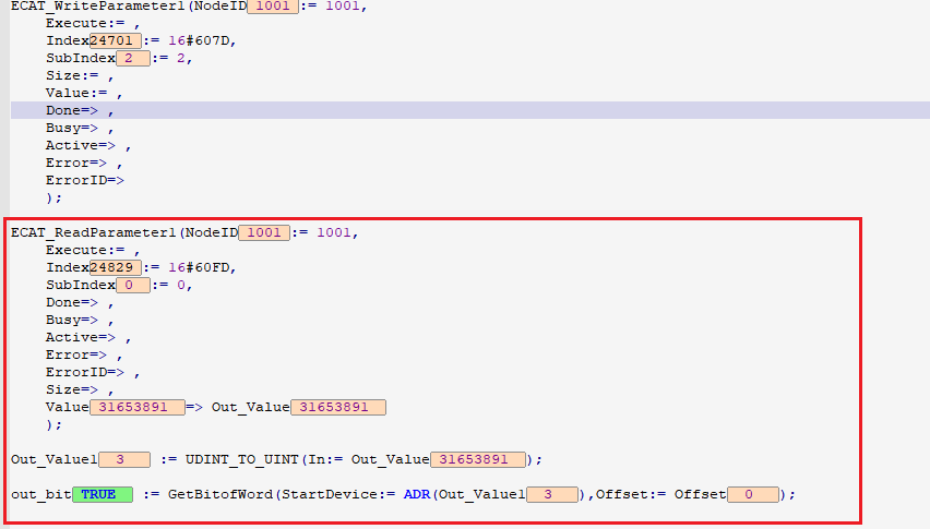 (1)通过 ECAT_ReadParameter或MC_ ReadParameter指令进行读取对象字典16#60FD的数值;