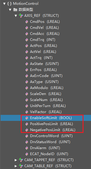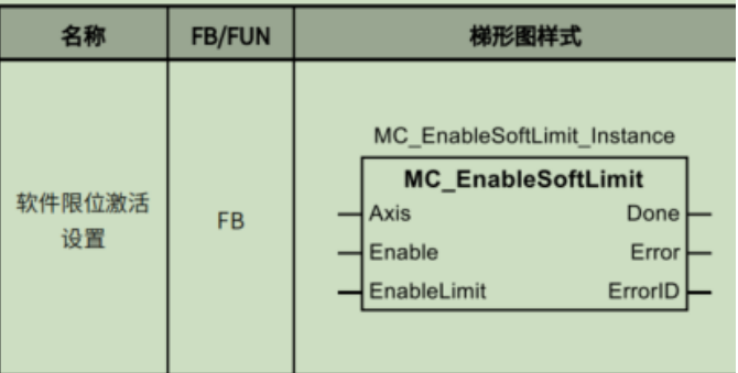 M系列轴设置界面的软件限位可以通过程序进行设定,可以使用MC_EnableSoftLimit功能块设定软件限位功能是否激活,通过轴结构参数中的PositivePosLimit和NegtivePosLimit进行正负限位值的读写。