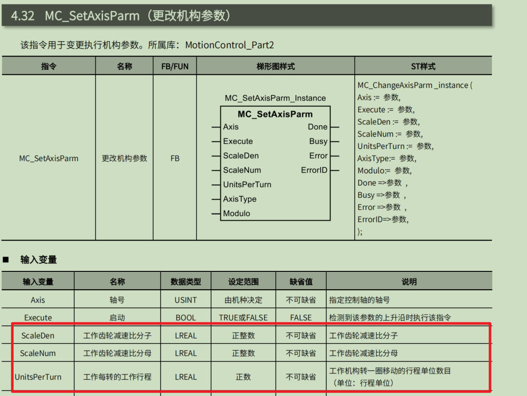M系列轴点索引中的工作齿轮减速比分子、分母和每转的工作行程程序里设置不生效,可以通过MC_SetAxisParm(更改机构参数)进行修改。
