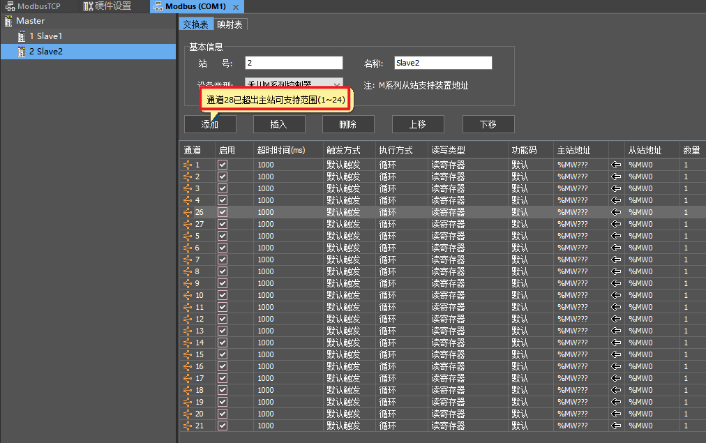M200、M300系列:Modbus TCP从站通道总数不超过16个;Modbus RTU从站通道总数不超过24个;