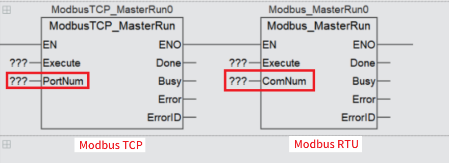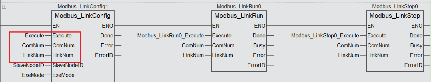【注2】若使用ModbusRTU读写从站参数超过通道数值限制时,可以使用功能块Modbus_LinkConfig、Modbus_LinkRun和Modbus_LinkStop在程序中进行通道配置切换使用,根据需要随时修改通道相关参数(通过功能块指令同时读写通道数也是按照以上限制)。
