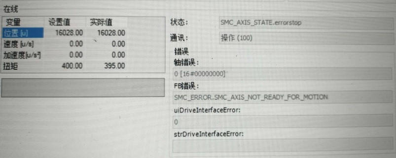 此故障为轴有通讯错误无法被复位,可以用重启轴指令SMC3_ReInitDrive或者重新重启主站进行复位尝试。