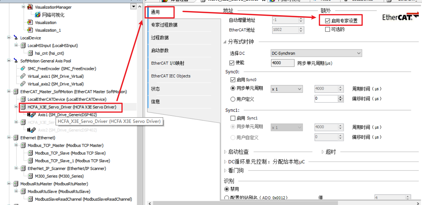 双击伺服进入通用界面,勾选【启用专家设置】
