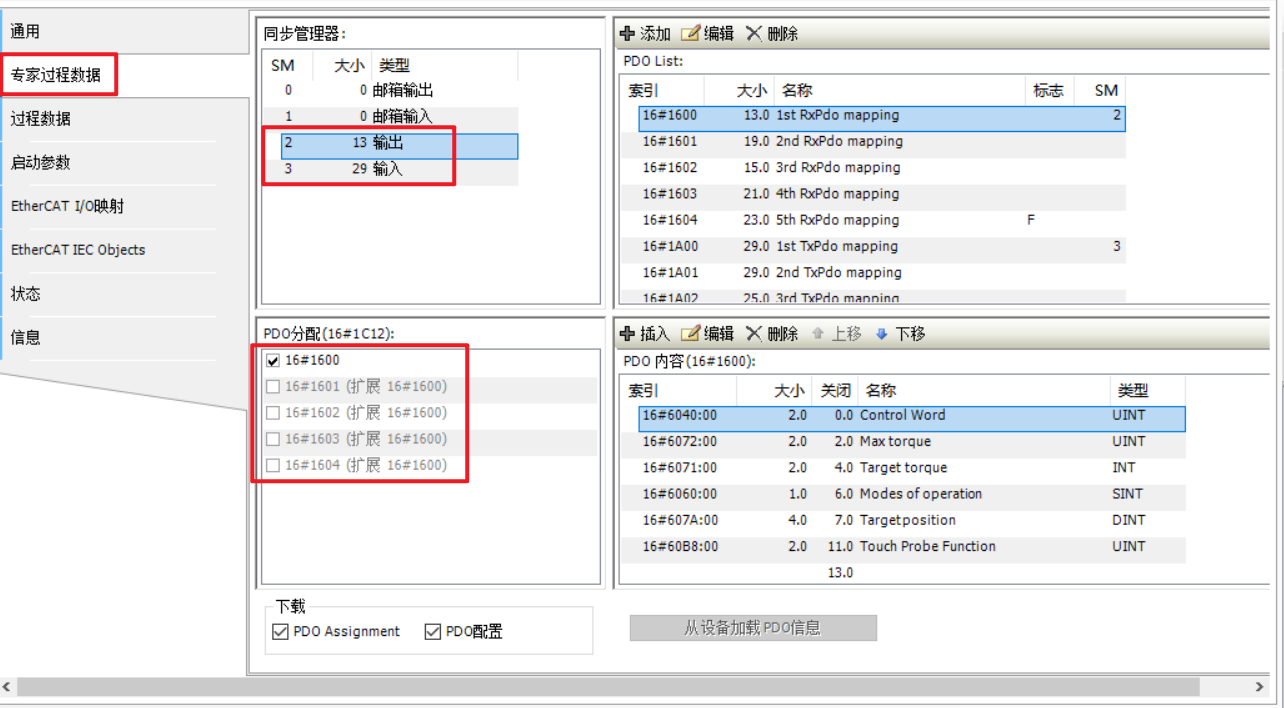 点开【专家过程数据】界面,在【同步管理器】中选中输出和输入后分别查看PDO分配中勾选的那一组PDO,默认输出为1600,输入为1A00。输出指PLC输出到伺服的对象字典,输入指伺服输入到PLC的对象字典。