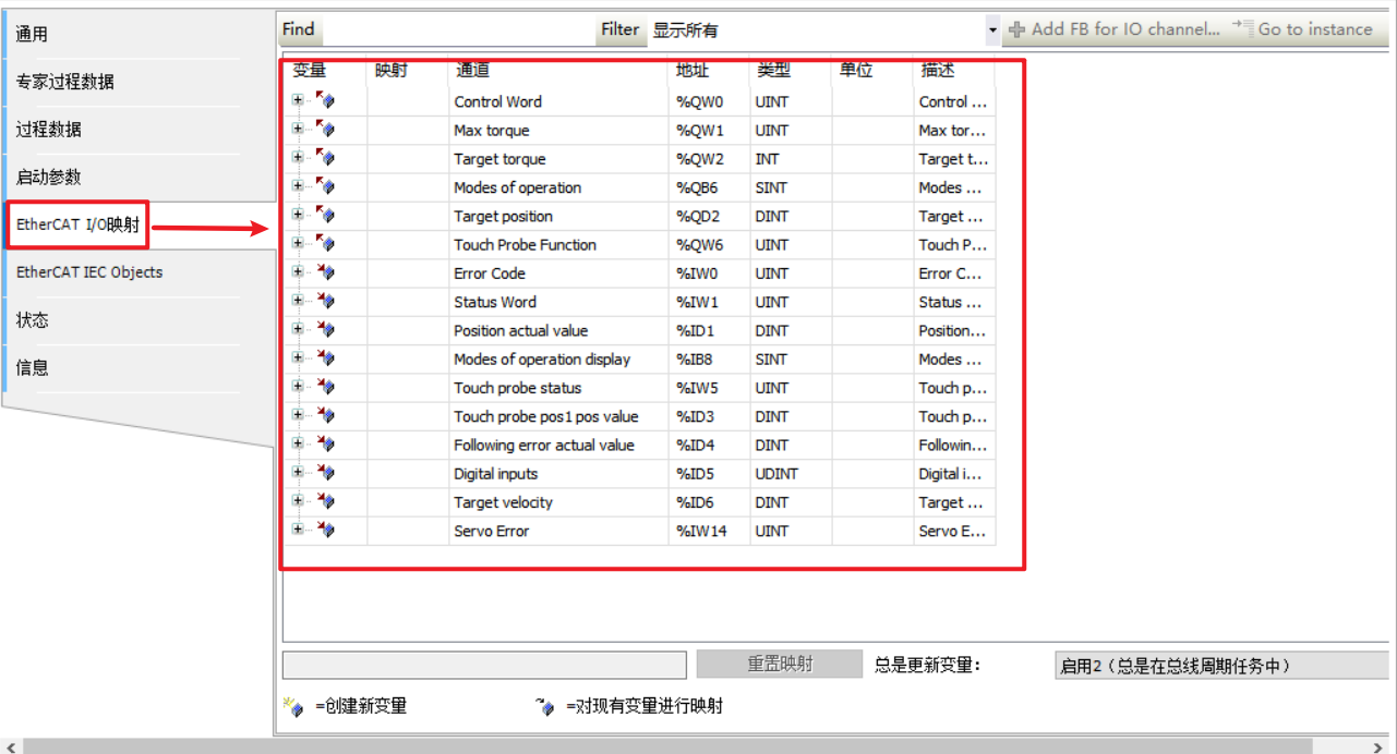 插入对象字典后,在IO映射界面会自动加入对应的对象字典。