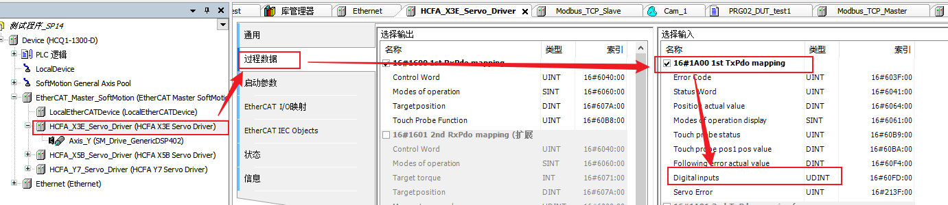 确认输出输入使用的那一组PDO后,右侧PDO list中选中对应的PDO组,如图中的16#1600,然后在PDO内容中点击插入,选择需要插入的对象字典即可。