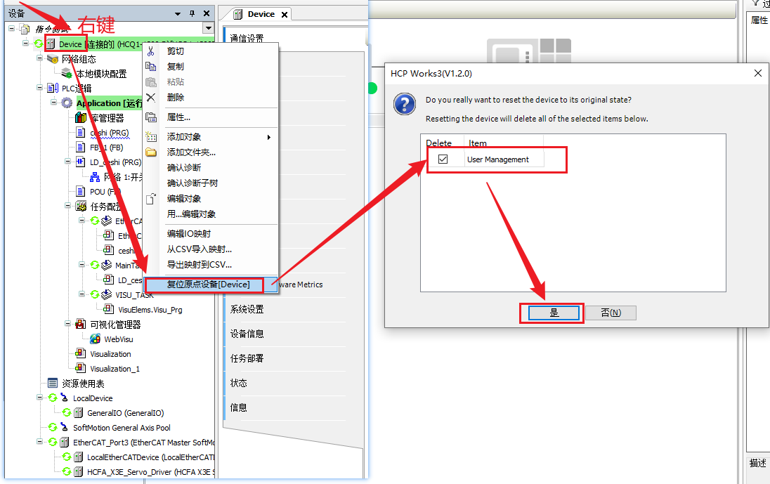 (2)右键【Device】--选择【复位原点设备】--勾选【User Managment】--【是】,然后会进行初始化PLC,连带PLC内部程序一起进行清空;
