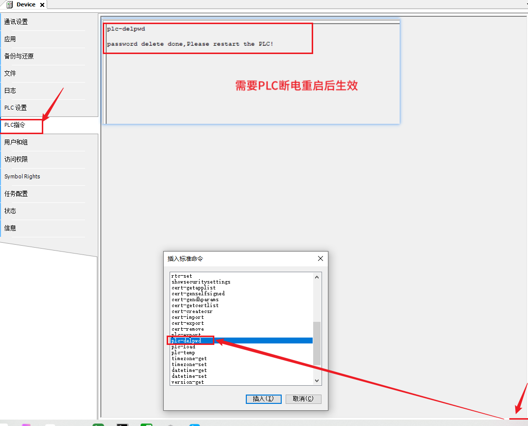 (4)对于高版本的PLC(如3.40.00.01及以上版本的Q1)可通过PLC指令【plc-delpwd】进行取消用户登录:
