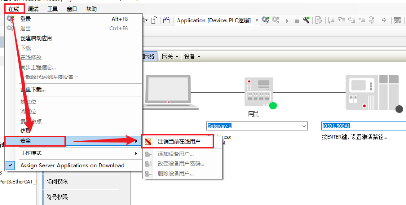 在成功使用清除密码指令后,再次上电发现扫描时还是出现要求登录账户的情况,通过状态栏--【在线】--【安全】中查看是否已经没有账户在线,如果还处于登陆状态,点【注销当前在线用户】,然后再次尝试扫描连接设备,此时可以直接连接到 PLC。