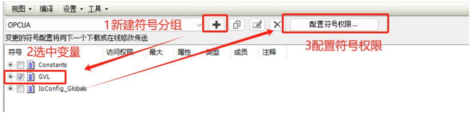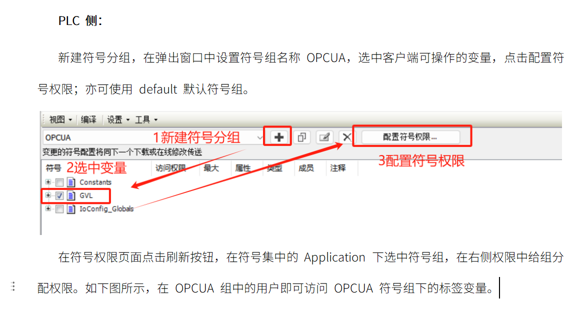 (2)PLC侧,新建符号分组,在弹出窗口中设置符号组名称 OPCUA,选中客户端可操作的变量,点击配置符号权限;亦可使用 default 默认符号组;