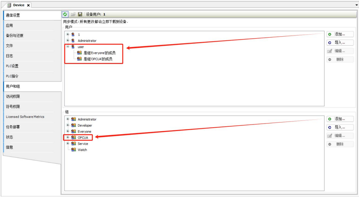(1)PLC 开启设备加密,创建用户和组。Devices→用户和组,在组中添加一个新的组,在用户中添加新的用户,把此用户分配到创建的组中;