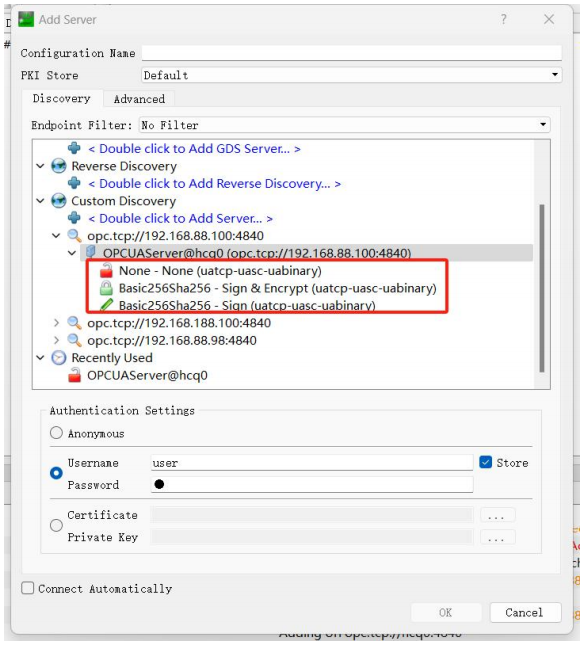 (6)OPCUA 客户端侧,发现服务器时,显示如下三个选项,PLC 即开启了加密通讯,选择 None(无安全策略),使用Username 和 Password 连接 OPCUA 服务器即可;