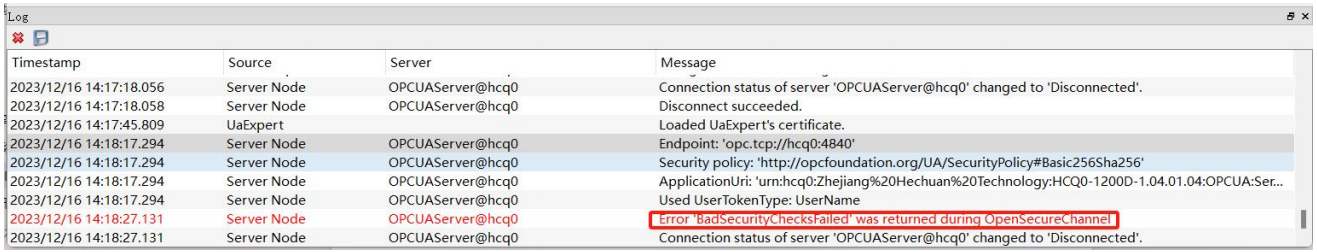 (7)使用 Sign&Encypt(签名和加密)和 Sign(签名)安全策略时,需要在 PLC 侧,把客户端的证书添加到信任区。使 用 Sign&Encypt ( 签 名 和 加 密 ) 和 Sign ( 签 名 ) 安 全 策 略 时 , 连 接 服 务 器 会 报 错BadSecurityChecksFailed,安全检查失败,需要 PLC 侧信任客户端的证书。报错显示如下: