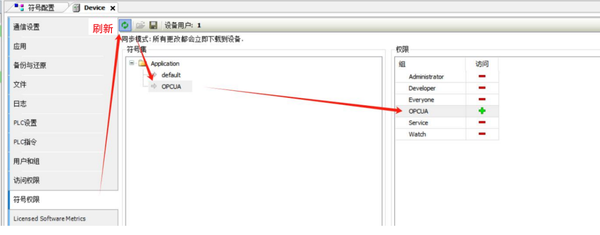 (4)在符号权限页面点击刷新按钮,在符号集中的 Application 下选中符号组,在右侧权限中给组分配权限。如下图所示,在 OPCUA 组中的用户即可访问 OPCUA 符号组下的标签变量。