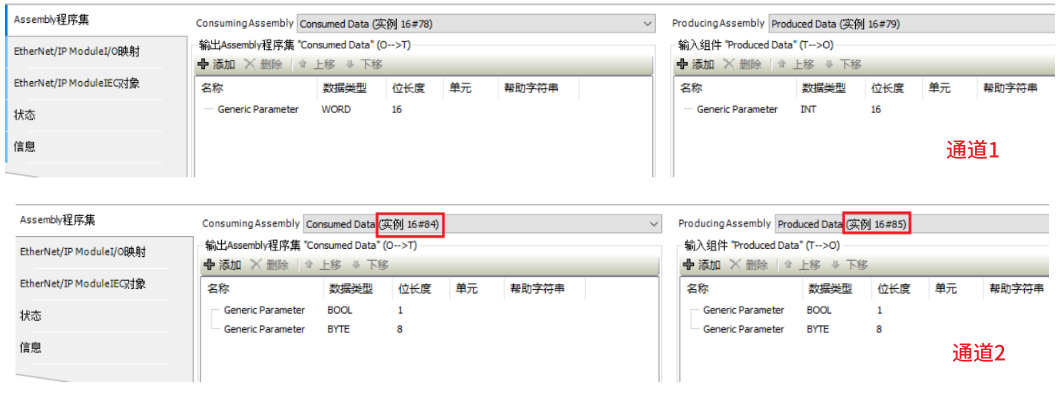 (1)适配器配置: 一个Adapter配置两个通道,不同通道需要使用不同的程序集,输入输出实例需要一一对应,导出一份EDS文件,分别导入两个扫描器;