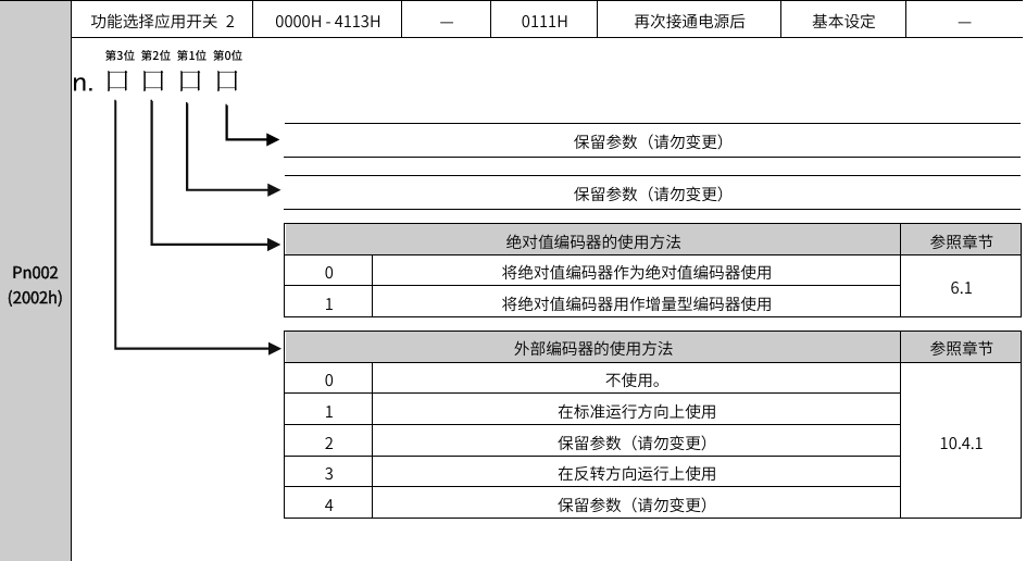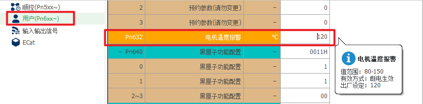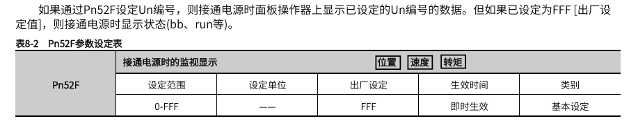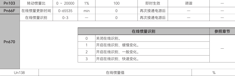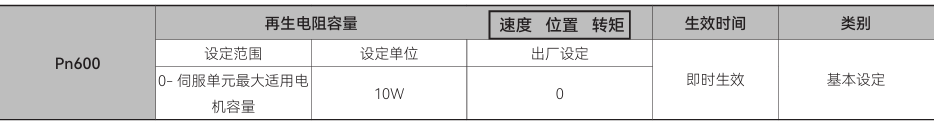 PN600单位为10W,具体参数设置值需要根据对应公式计算:3.1)当再生电阻处于自然冷却时,再生电阻容量按照20%计算。例:选择外置再生电阻器的容量为50W时,设定值为50W×20%=10W,因此应设为Pn600=1(设定单位:10W);3.2)当再生电阻处在强制风冷(有加装散热风扇)时,再生电阻容量安装50%计算。例:选择外置再生电阻器的容量为50W时,设定值为50W×50%=25W,因此应设为Pn600=2(设定单位:10W),当处在带有小数无法设置时向下取整。