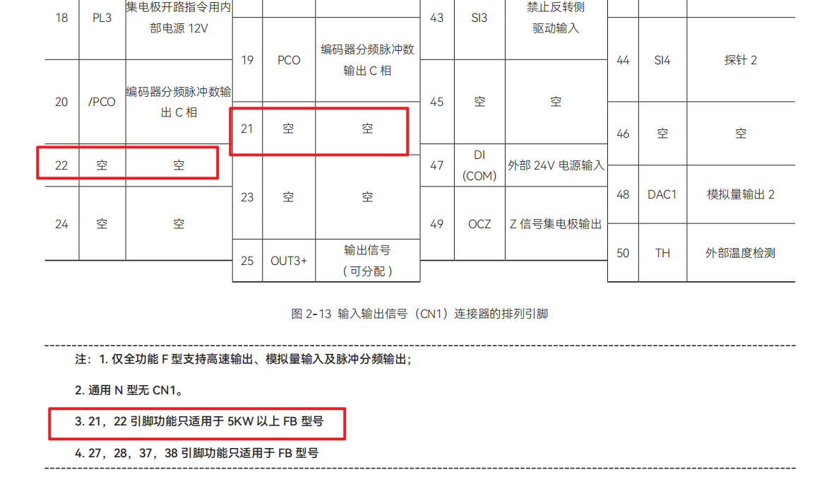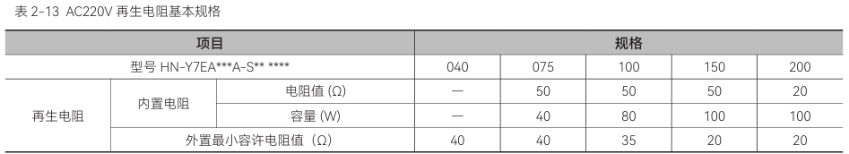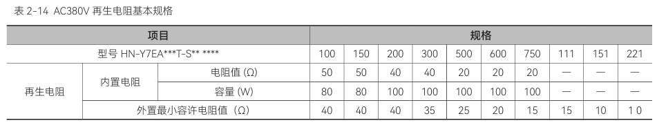 (2)再生电阻功率和阻值设置根据主回路输入电源电压不同存在区别,再生电阻选型时阻值最小不能小于表中要求阻值,且再生电阻阻值放大时,再生电阻功率需要对应放大,再生电阻功率最大不能超过驱动器功率。