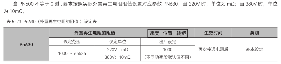 (4)PN630再生电阻阻值设置:根据功率不同PN630的默认值不同,设置PN630再生电阻阻值时根据输入电源的电压不同该参数的单位不同,220V电压时PN630单位为mΩ(毫欧),380V电压时10mΩ(毫欧)。