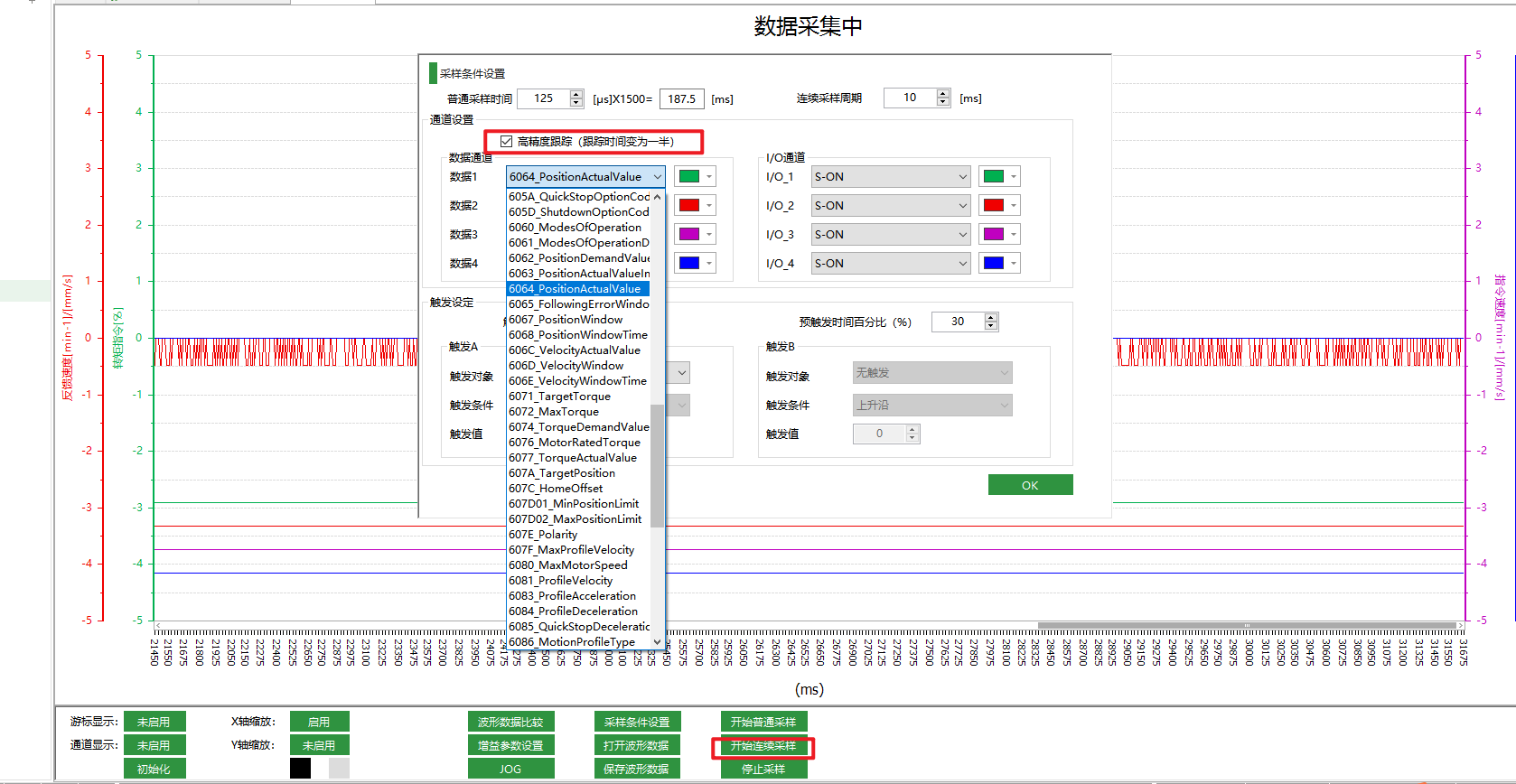 注:连续采样可直接观察整体波形变化,但现场存在启动慢,或停止过冲,或匀速段抖动的问题,需要抓取特定段观察分析时,请使用普通采样。