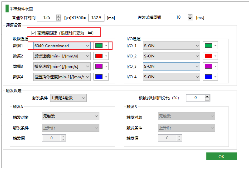 另外总线驱动器可通过勾选高精度跟踪,可抓取对象字典60组参数变化,注意这时候触发条件不生效,可直接拉长普通采样时间无触发采样或者进行连续采样。