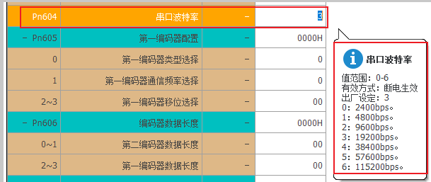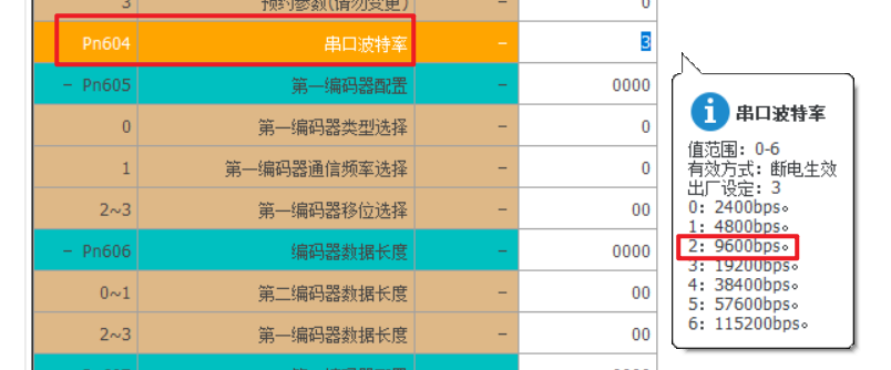 通讯波特率设置:Pn604=2(可根据所需自行修改,修改后,主站侧波特率也需对应设置);