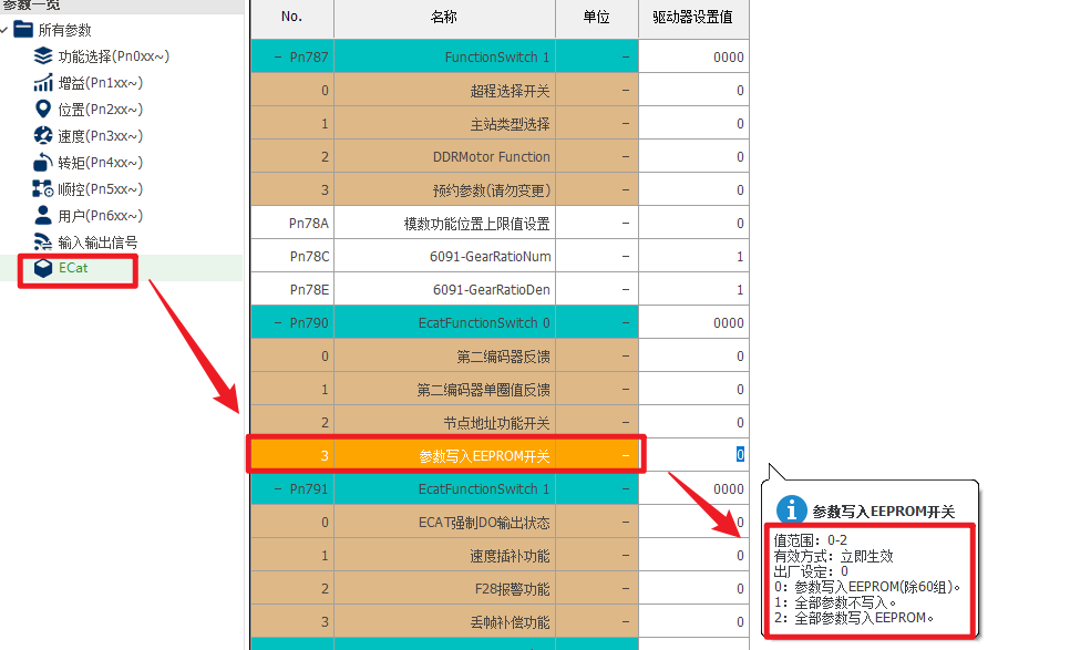 需通过伺服面板或调试软件进行修改以下对应参数,