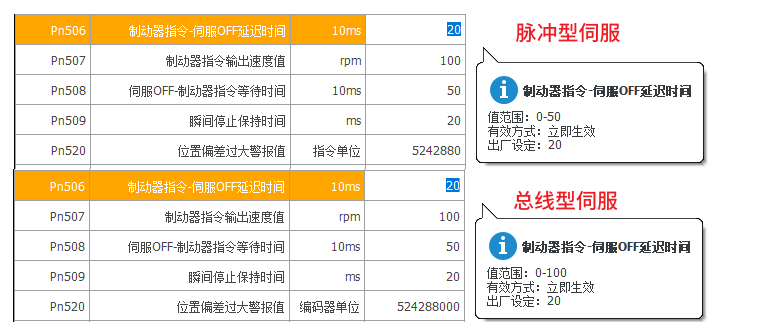 Pn506 设置为 50,表示断使能后驱动器输出转矩保持时间 500ms 停止输出(等待抱闸生效后撤销转矩保持)。即外部的伺服 OFF 信号给到伺服后,伺服会先 OFF 抱闸解除信号,然后延迟Pn506 设置的时间后再切断电机的电流。如果 Pn506 设置的时间大于电机抱闸动作的时间,理论上断使能后和使能前的位置一致。
