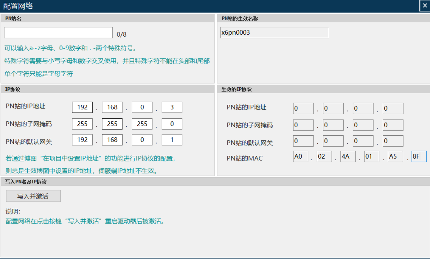 方法1:伺服调试软件连接好伺服之后,通过伺服调试软件的网络配置界面进行设置伺服从站的IP地址,子网掩码,网关;