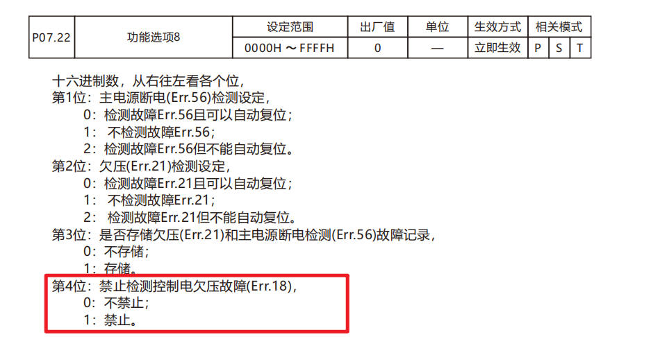 (5)将功能选项8(P07.22)从右往左第二位----欠压ERR.21检测设定设为1,重新上电后将不检测故障ERR021,但是不建议进行屏蔽。