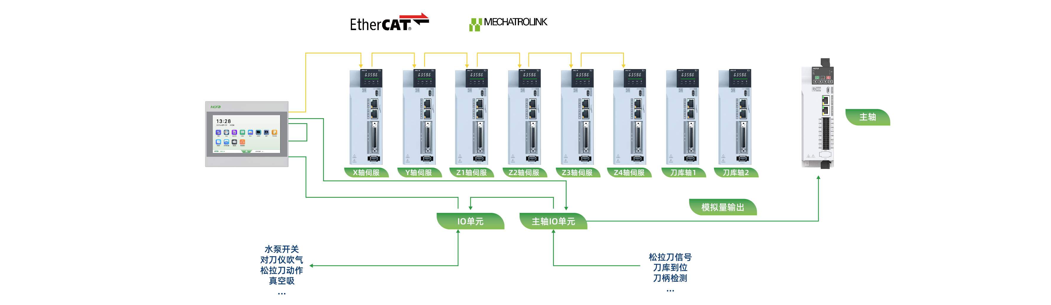 精雕机主要由系统、进给轴伺服、刀库轴伺服、高转速主轴等组成,机型差异主要是设备大小不同,对应选择的功率段不同,此外还有工位、Z轴轴数不同,是否配备刀库功能。 根据Z轴数量,即加工主轴个数的不同,又分为单头精雕机、双头精雕机、三头精雕机、四头精雕机。 精雕机机床主体底座和床身采用大理石,这样不受温度影响,床身稳定,永久不变形,加工精度高,高速运行稳定性好。 精雕机主轴转速有40000-60000转,一般由模拟量变频器控制。 精雕机搭配过的系统主要有:谋迅、华中、宝元、固高、铼钠克、新代、沙迪克、维宏系统等,根据系统来选择不同的伺服型号,目前驱动器型号选择Y7S系列,电机选择X6 MGS系列。