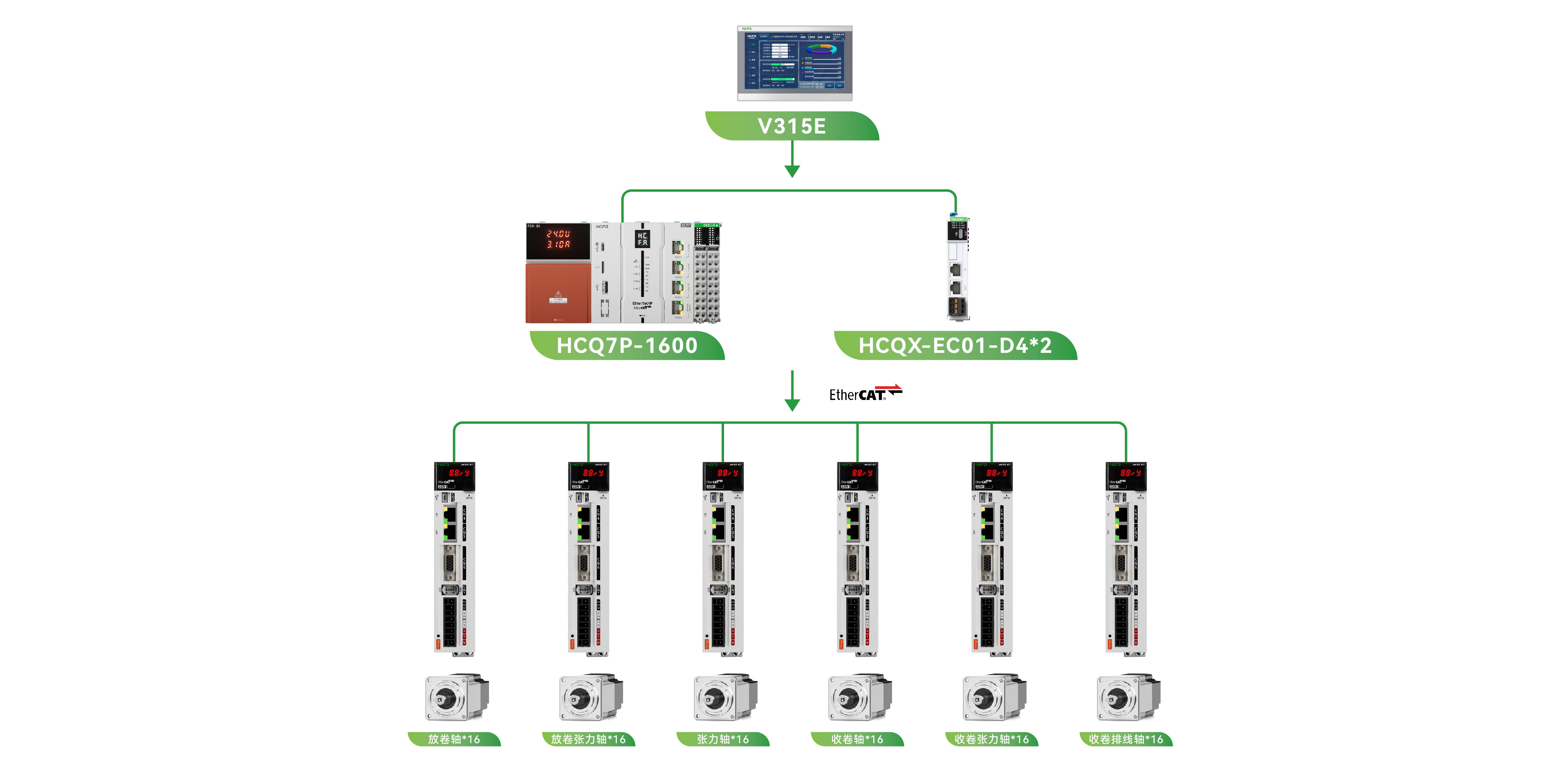 采用禾川Q7P高性能控制器,通过双EtherCAT主站,实现8线+8线的分开控制