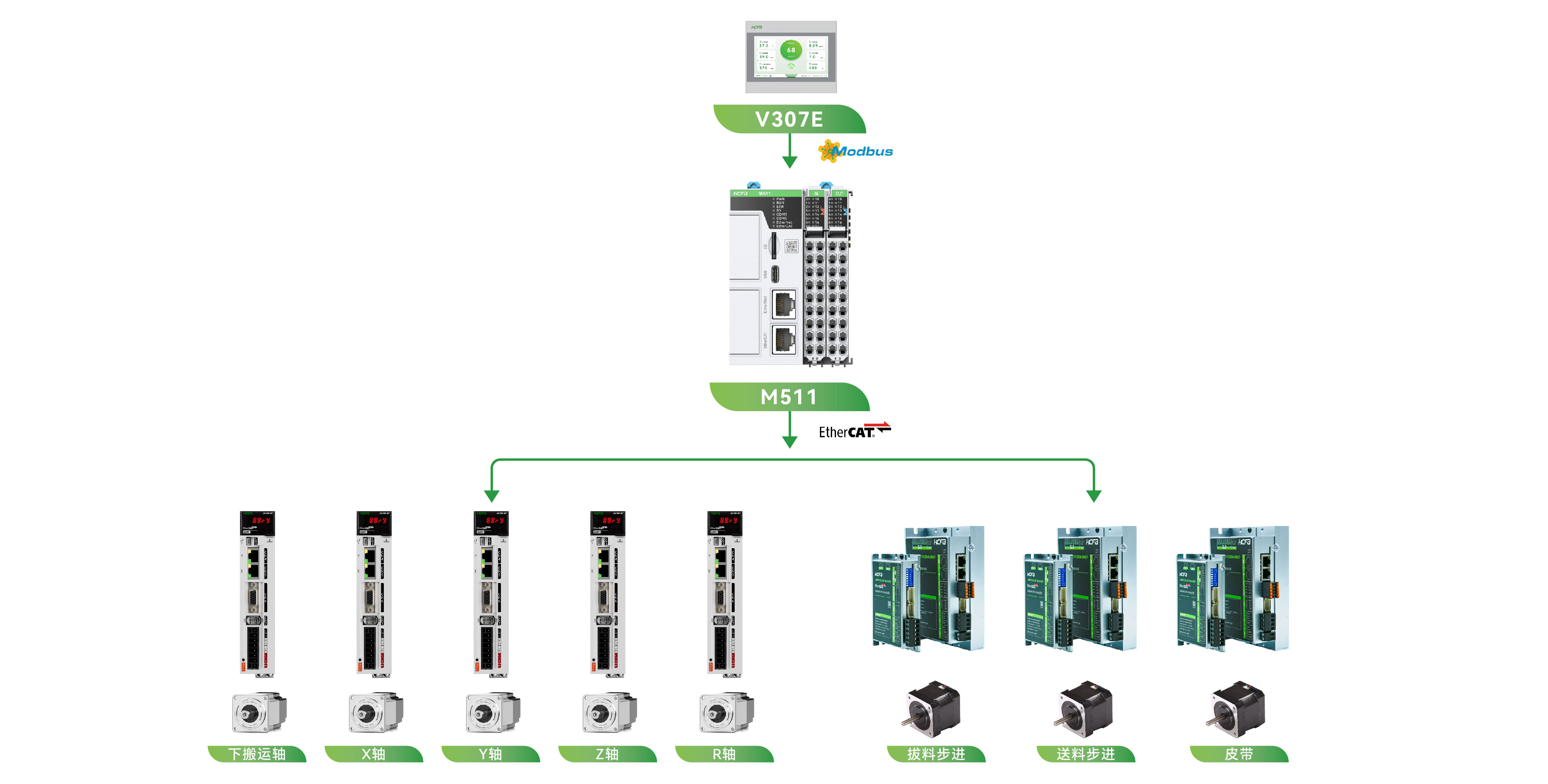 该方案使用禾川V307E触摸屏+M511控制器+X5/X2伺服+步进的整套模组方案,单吸头CT稳定达到5s两个产品,同时可拓展双头或多头,相比机器人方案可降低成本同时能保证效率。